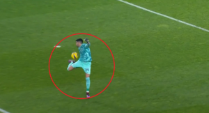 Olandezul a trimis apoi o centrare către portarul echipei sale, Rui Silva. Totuși, acesta a încercat să facă o preluare spectaculoasă, însă s-a făcut de râs, după ce mingea a ajuns în poartă.