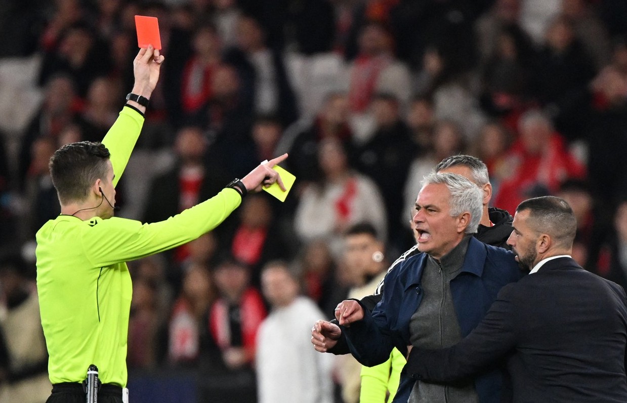 Acesta nu a fost singurul moment tensionat de la Lisabona. Antrenorul Jose Mourinho a fost eliminat, după ce a încasat două cartonașe galbene pentru proteste. Astfel, ”The Special One” nu va sta pe bancă la returul de pe ”Santiago Bernabeu”.