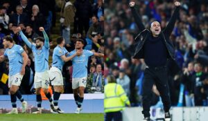 Echipa engleză Manchester City a învins, dramatic, marţi seara, pe teren propriu, scor 2-1, formaţia Aston Villa, în etapa a 34-a din Premier League. Antrenorul „cetăţenilor”, Pep Guardiola, nu şi-a ascuns bucuria fără margini. Guardiola a fost surprins în culmea fericirii. Şi-a îmbrăţişat jucătorii şi s-a descătuşat după golul victoriei, marcat de Matheus Nunes, în minutul 90+4.