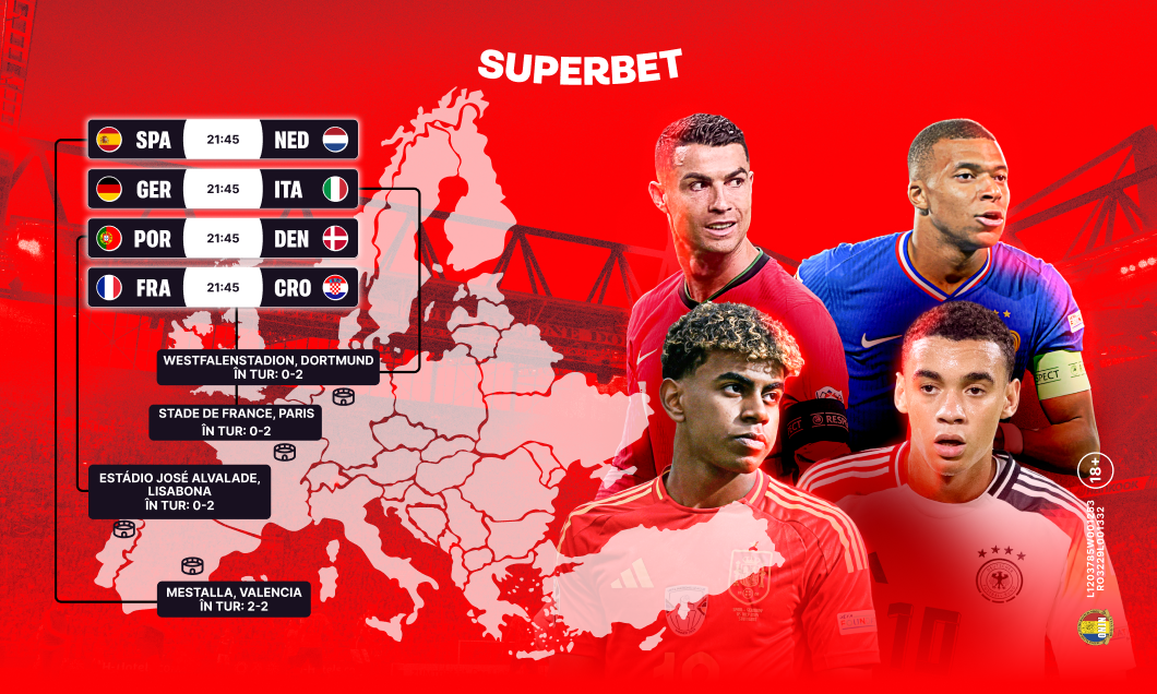 Mbappe, Ronaldo, Yamal și Musiala sunt doar câteva dintre vedetele care intră în acțiune, live pe Superbet alături de o gamă variată de opțiuni pentru pariuri sportive: BetBuilder, Streaming, SuperPariuri, Cote Mărite și Pariuri Speciale.