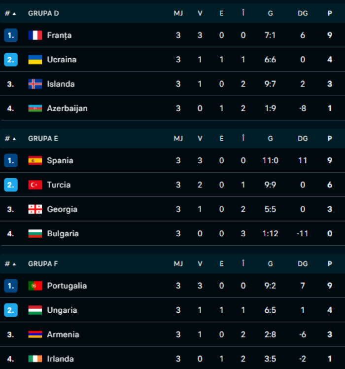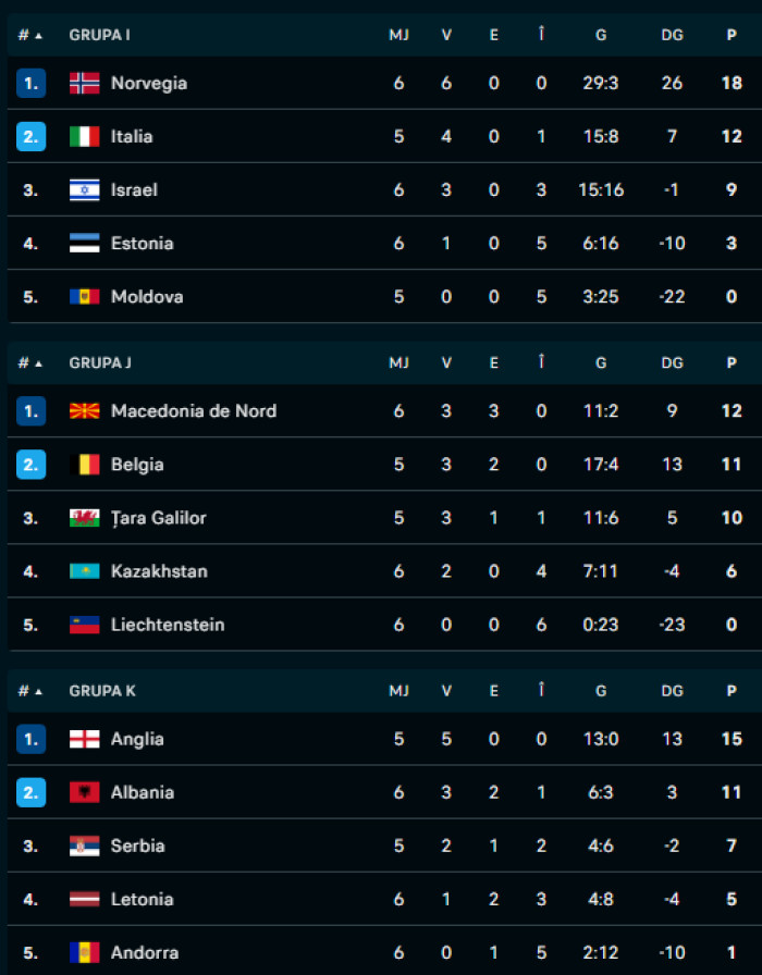 Clasamentele din Grupele A, B, D, E, F, I, J și K din preliminariile Cupei Mondiale