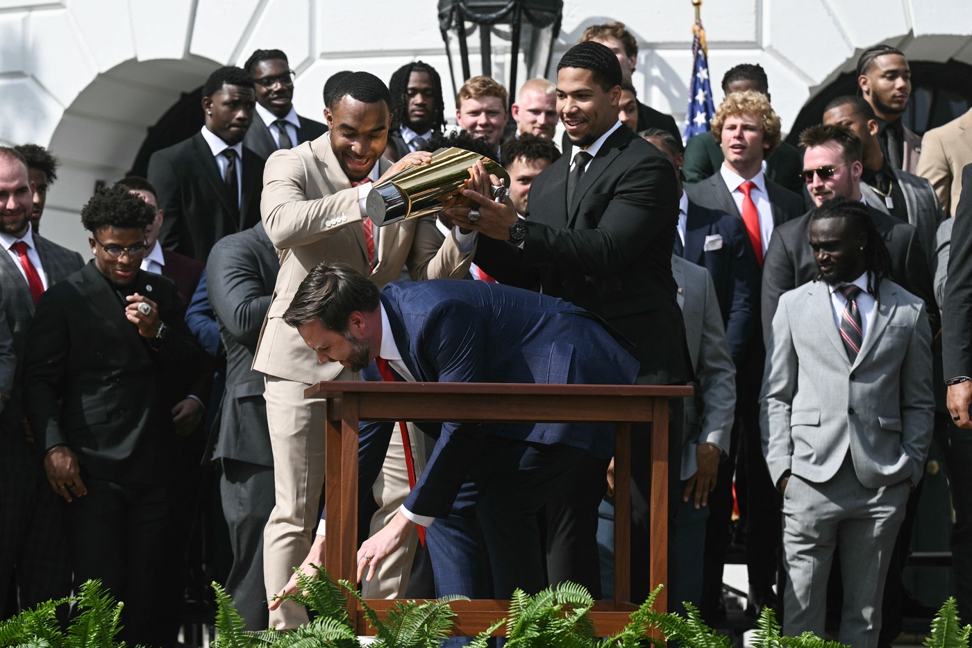 În timpul unei festivităţi de la Casa Albă, pentru Ohio State Buckeyes, statul natal al lui JD Vance, politicianul a scăpat trofeul campionatului naţional de fotbal universitar, în timp ce încerca să îl ridice (FOTO în galeria de mai jos).