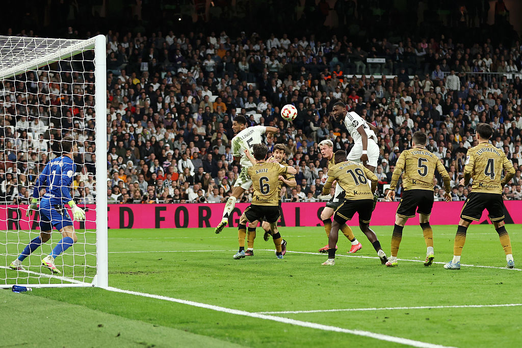 Min 48: Real Madrid solicită lovitură de la 11 metri. Jude Bellingham este pocnit în față de Remiro, după ce goalkeeperul încearcă să respingă un balon. Arbitrul nu acordă nimic.