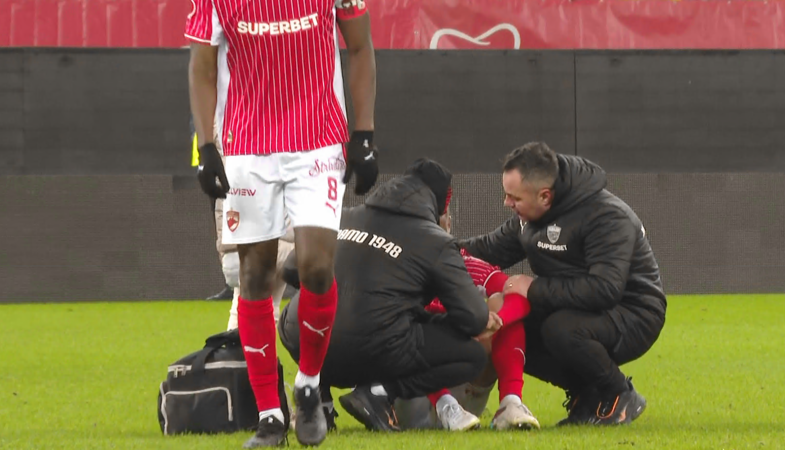 Medicul de la Dinamo s-a dus către jucătorul de la Dinamo, a analizat situația acestuia, după care l-a însoțit pe mijlocaș către zona vestiarelor.