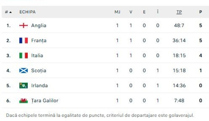 Clasamentul Turneului celor 6 Națiuni, după prima etapă
