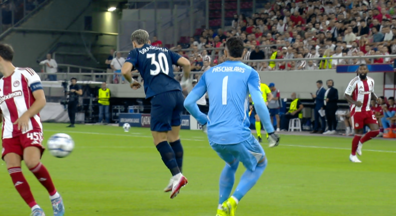 Pafos a început tare partida, iar românul Dragomir ar fi putut marca după doar 50 de secunde. Pascalakis, goalkeeper-ul celor de la Olympiacos, a degajat balonul, însă în picioarele lui Vlad Dragomir, iar mingea a trecut cu puțin pe lângă poartă!